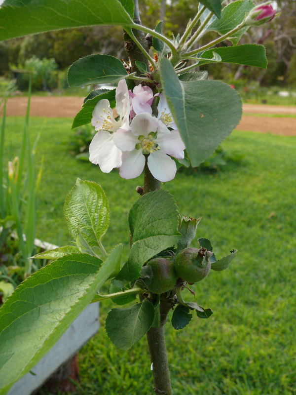 Now you may just have to trust me on this, but here is a photo of the very first puff of smoke coming out of our brand new chimney. :-) On the garden front, this was a pleasing sight. We haven't planted our orchard yet, as we had to wait until only recently to know where all the earthworks were going to be.... we didn't want to plant fruit trees then have to shift them all, so we postponed it. But we do have one small apple tree in a pot. Steve bought it as a minute stick via mail order from Diggers Club. We've had it for about 18 months and it has suddenly had a growth spurt. It's an old English variety cooking apple called a Bramley. It has suddenly burst into blossom and if you look carefully at the bottom of the photo, yes, there are two tiny apples there!! Maybe more to come, but as it's such a tiny tree we'll have to pull off any more than about four or five we think. I never knew apple blossom had a scent, these flowers smell just lovely.