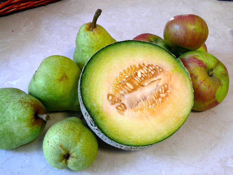 We picked the final few pears today, 9 kilos in total. It took us a while to work out when the right time was to pick them so we had a few dodgy ones. I dehydrated a dozen....peeled, cored and sliced them, then soaked briefly in water with a lemon squeezed in to stop them going brown, then a brush with a little bit of honey (as I was drying ones that weren't quite ripe). They are a very nice snack. We failed with the right time to pick the rock melon too, it's a bit under-ripe. Two earlier ones were scoffed by creatures of the night so we were trying to beat them to it! Food growing is a continuous learning curve. One the right is the last of the Bramley apples, very early this year, they are soooo nice as a stewed fruit with rhubarb.
